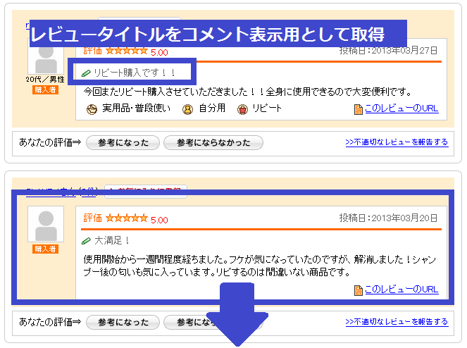 レビュー内容 コメント用レビュータイトル を取得するのも簡単!? ![]() をクリックするだけ! |