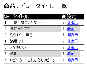 取得したレビュータイトルの表示設定 (件数、評価) ![]() 上記の設定の他に、個別にも表示非表示設定ができます |