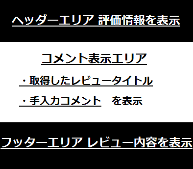 サンプル2 ■ヘッダーエリア 総合評価、評価詳細を表示 ■コメント 手入力+取得したレビュータイトルを 右から左に自動スライド ■フッター レビュー内容スクロール表示 |